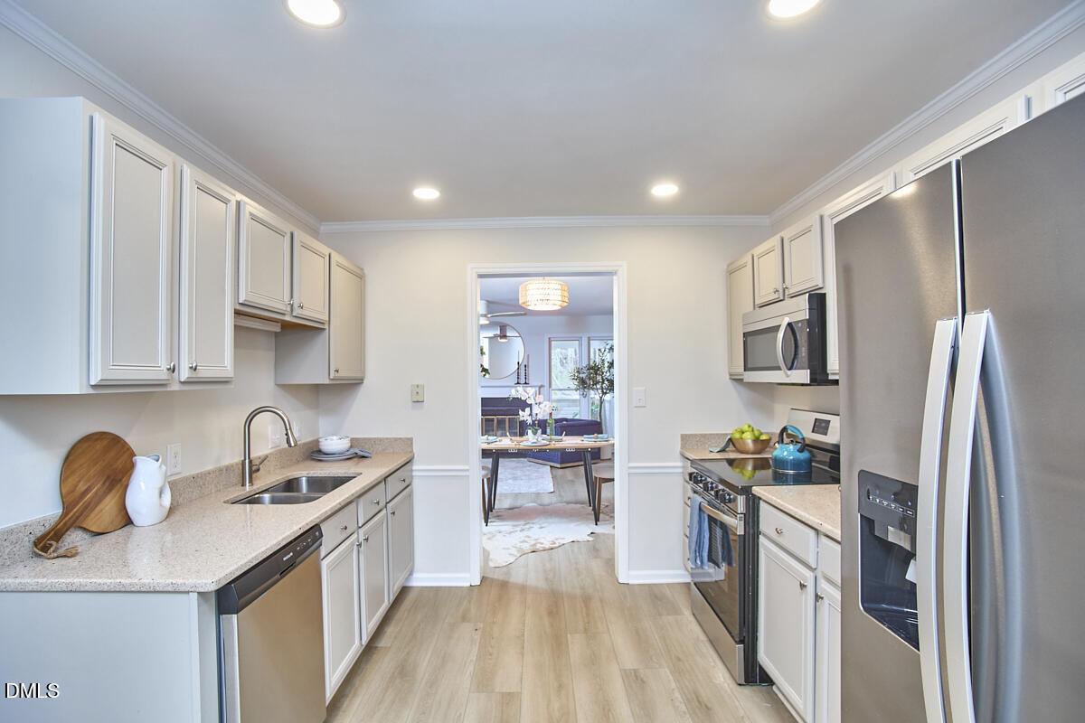 This move-in ready home features two spacious primary suites and extensive 2025 updates, including a renovated kitchen, LVP flooring and carpet, updated lighting and ceiling fans, appliances refrigerator. The private backyard retreat includes a screened porch with skylights, and the home offers thoughtfully designed living spaces throughout, all just steps from greenway trails and neighborhood amenities.