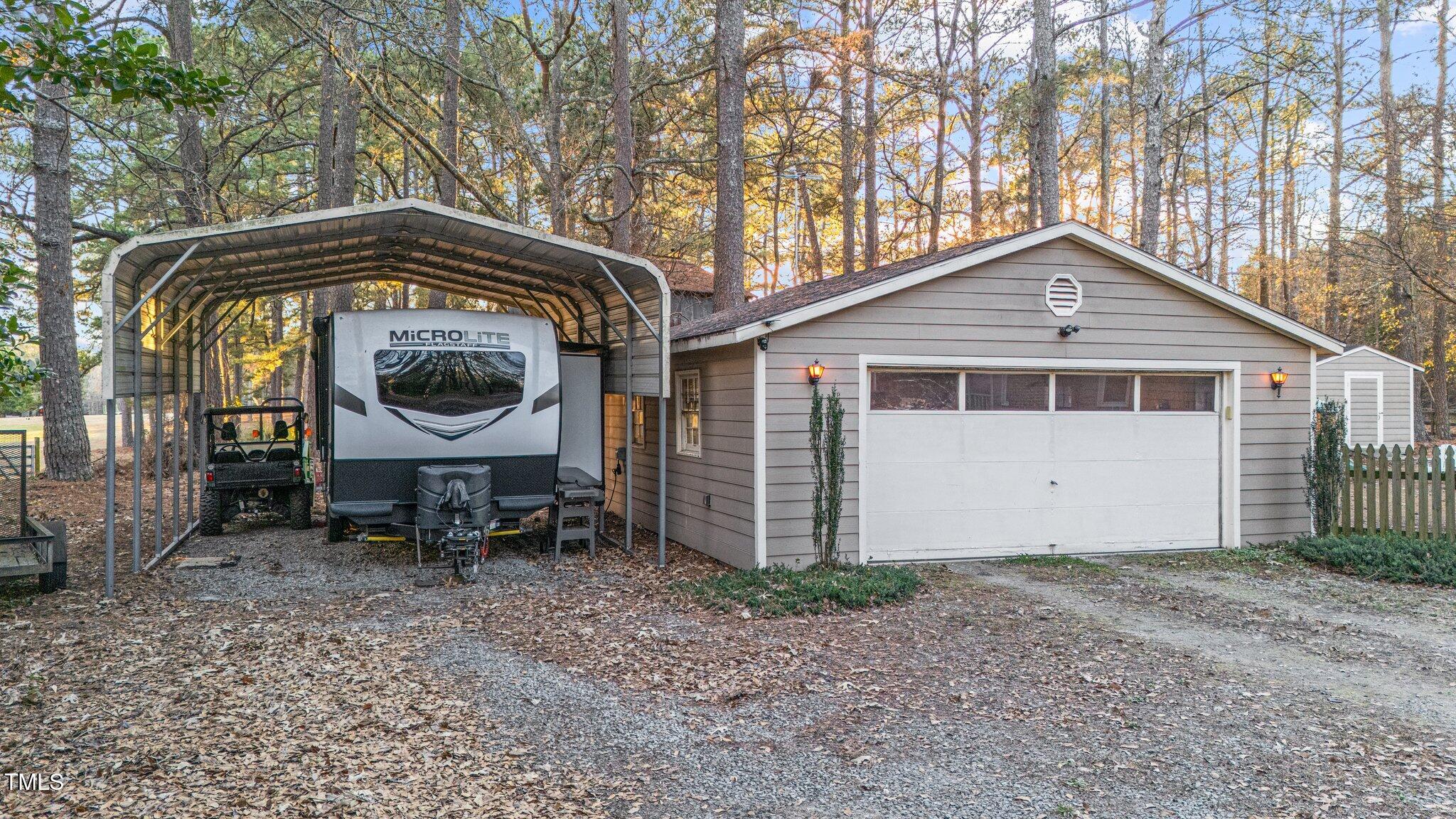French doors with blinds lead out to large deck overlooking a spacious fenced back; equipment & additional storage sheds with shelves in addition to a bonus RV Carport with 30 amp connection. Security camera mounted on the front of the garage does not convey. Chicken Coop conveys or can be removed.